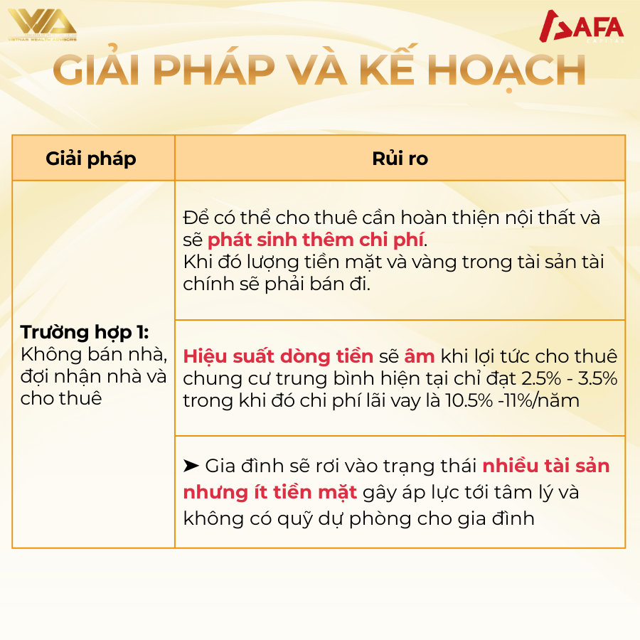 – Để có thể cho thuê cần hoàn thiện nội thất và sẽ phát sinh thêm chi phí. Khi đó lượng tiền mặt và vàng trong tài sản tài chính sẽ phải bán đi.