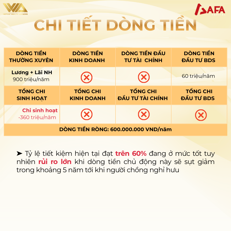 ➤ Dòng tiền: Tỷ lệ tiết kiệm hiện tại đạt trên 60% đang ở mức tốt tuy nhiên rủi ro lớn khi dòng tiền chủ động này sẽ sụt giảm trong khoảng 5 năm tới khi người chồng nghỉ hưu.