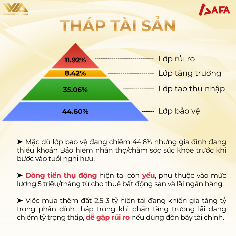 Mặc dù lớp bảo vệ đang chiếm 44.6% nhưng gia đình đang thiếu khoản Bảo hiểm nhân thọ/chăm sóc sức khỏe trước khi bước vào tuổi nghỉ hưu. Dòng tiền thụ động hiện tại còn yếu, phụ thuộc vào mức lương 5 triệu/tháng từ cho thuê bất động sản và lãi ngân hàng. Việc mua thêm đất 2.5-3 tỷ hiện tại đang khiến gia tăng tỷ trọng phần đỉnh tháp trong khi phần tăng trưởng lãi đang chiếm tỷ trọng thấp, dễ gặp rủi ro nếu dùng đòn bẩy tài chính.