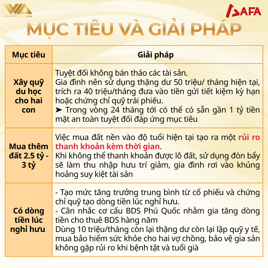 Tuyệt đối không bán tháo các tài sản. Gia đình nên sử dụng thặng dư 50 triệu/ tháng hiện tại, trích ra 40 triệu/tháng đưa vào tiền gửi tiết kiệm kỳ hạn hoặc chứng chỉ quỹ trái phiếu. Trong vòng 24 tháng tới có thể có sẵn gần 1 tỷ tiền mặt an toàn tuyệt đối đáp ứng mục tiêu.