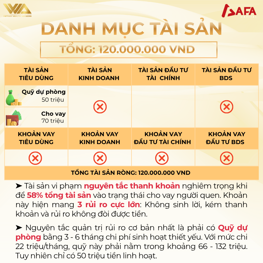 ➤ Nguyên tắc quản trị rủi ro cơ bản nhất là phải có Quỹ dự phòng bằng 3 – 6 tháng chi phí sinh hoạt thiết yếu. Với mức chi 22 triệu/tháng, quỹ này phải nằm trong khoảng 66 – 132 triệu. Tuy nhiên chỉ có 50 triệu tiền linh hoạt.