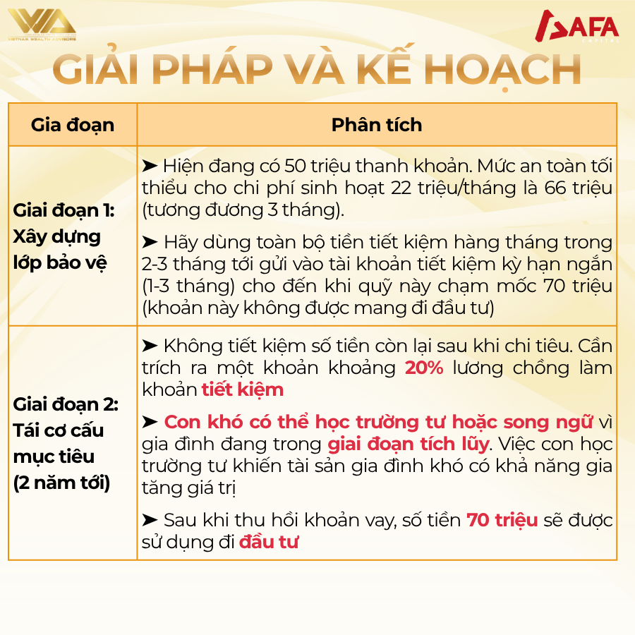 Lưu ý: Các phân tích và giải pháp trên được xây dựng dựa trên những thông tin ban đầu bạn cung cấp. Để nhận tư vấn chuyên sâu và cá nhân hóa hơn cho trường hợp của mình, vui lòng liên hệ AFA Capital qua email contact@afacapital.vn hoặc hotline 096 492 6488.