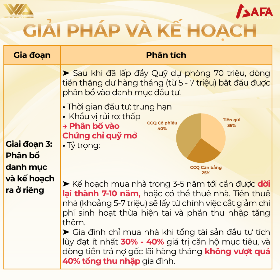 • Kế hoạch mua nhà trong 3-5 năm tới cần được dời lại thành 7-10 năm. Trong 3-5 năm tới, nếu bắt buộc phải ra ở riêng, giải pháp an toàn là thuê nhà. Tiền thuê nhà (khoảng 5-7 triệu) sẽ lấy từ chính việc cắt giảm chi phí sinh hoạt thừa hiện tại và phần thu nhập tăng thêm. Gia đình chỉ mua nhà khi tổng tài sản đầu tư tích lũy (từ chứng chỉ quỹ và khoản 70 triệu thu về) đạt ít nhất 30% – 40% giá trị căn hộ mục tiêu, và dòng tiền trả nợ gốc lãi hàng tháng không vượt quá 40% tổng thu nhập gia đình.