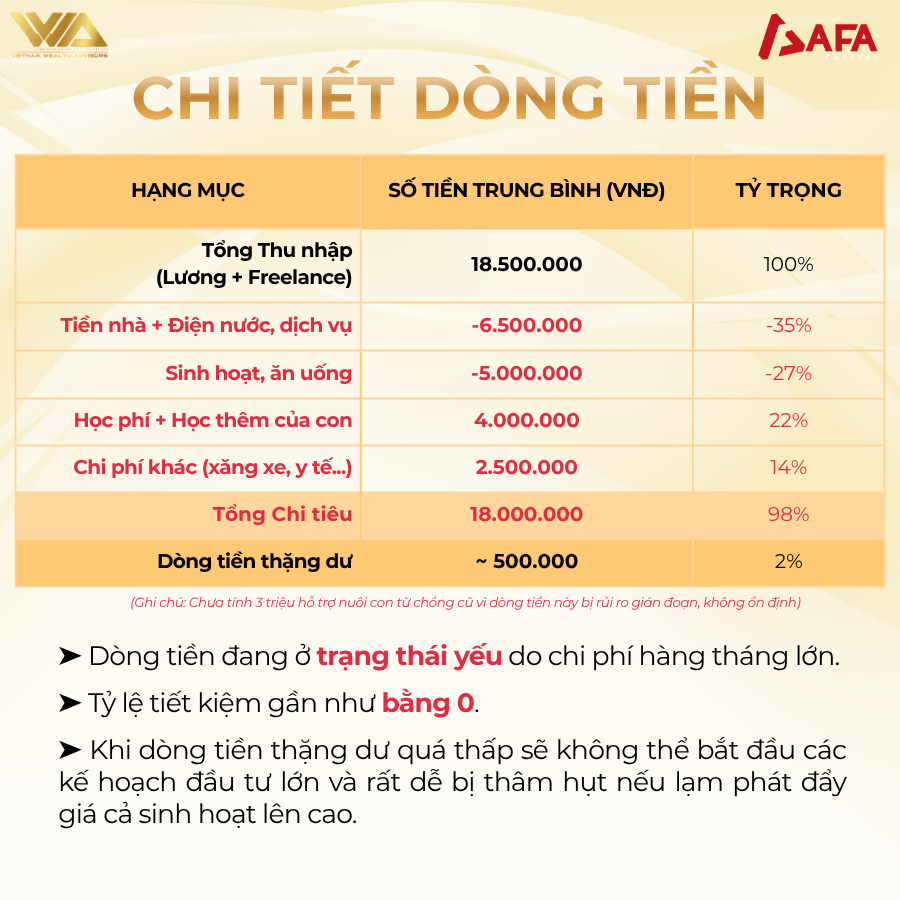 ➤ Dòng tiền đang ở trạng thái yếu do chi phí hàng tháng lớn. Tỷ lệ tiết kiệm gần như bằng 0. Khi dòng tiền thặng dư quá thấp sẽ không thể bắt đầu các kế hoạch đầu tư lớn và rất dễ bị thâm hụt nếu lạm phát đẩy giá cả sinh hoạt lên cao.