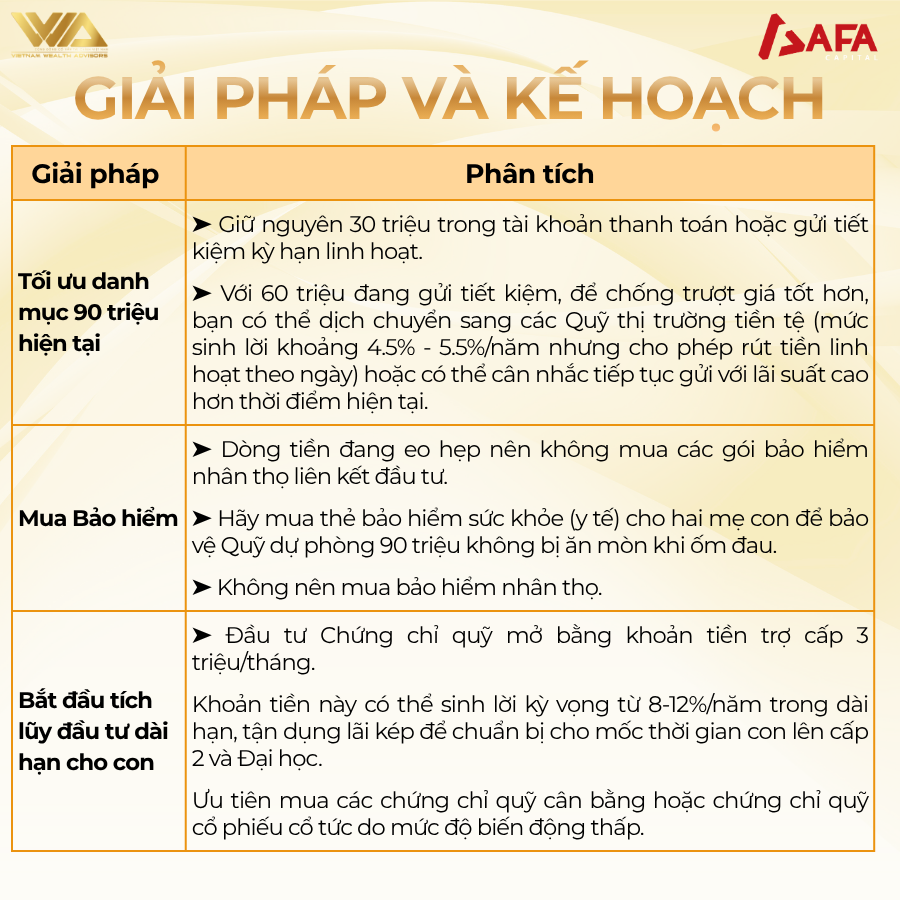 Thực sự sau khi ly hôn, em mới thấy việc tài chính quan trọng đến mức nào đặc biệt khi mình là người duy nhất chịu trách nhiệm cho con. Em rất mong nhận được lời khuyên từ anh chị để em có thể lên kế hoạch rõ ràng hơn cho hai mẹ con trong những năm tới ạ. Em cảm ơn anh chị rất nhiều.”